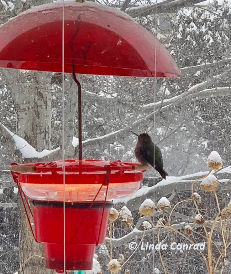 NEVER ignore a hummingbird that is clearly in trouble – sleeping in a location that seems off, bill frozen to the feeder, tongue sticking out, dropping out of the air, fallen into the snow, extended daytime ‘sleeping’ (torpor) on the feeder, or just bedraggled looking.